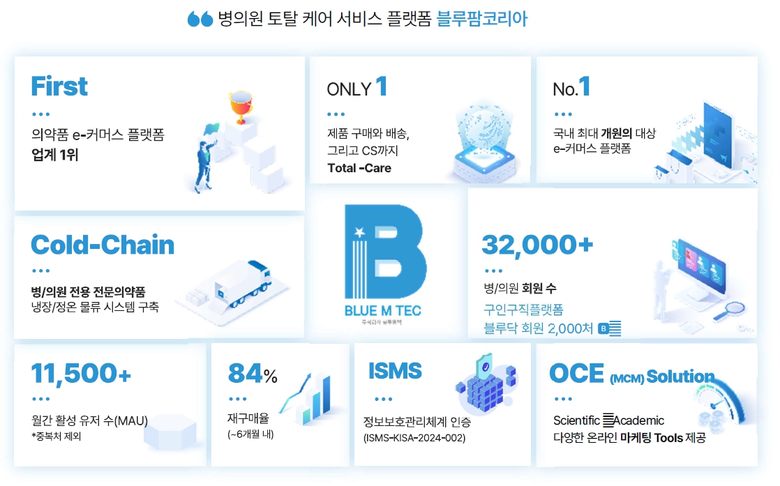 ◎ 특성: 제약 및 의료 전문 쇼핑몰로, 의사와 약사를 대상으로 하는 쇼핑몰로 의료계의 쿠팡이라 불리는 매체로 제약유튱업계 최초 상장한 회사로 관심도가 높습니다. 전문 약품 정보 및 최신 제약 트렌드도 확인이 가능하기 때문에 의사들이 자주 방문하는 사이트로 병의원 90%가 가입한 사이트입니다. 병의원 사업자가 아니면 가입이 안되며, 블루팜에서만 판매하는 필수 상품들이 많습니다. 의사들 대상으로 홍보하려면 필수인 매체라고 볼 수 있습니다.